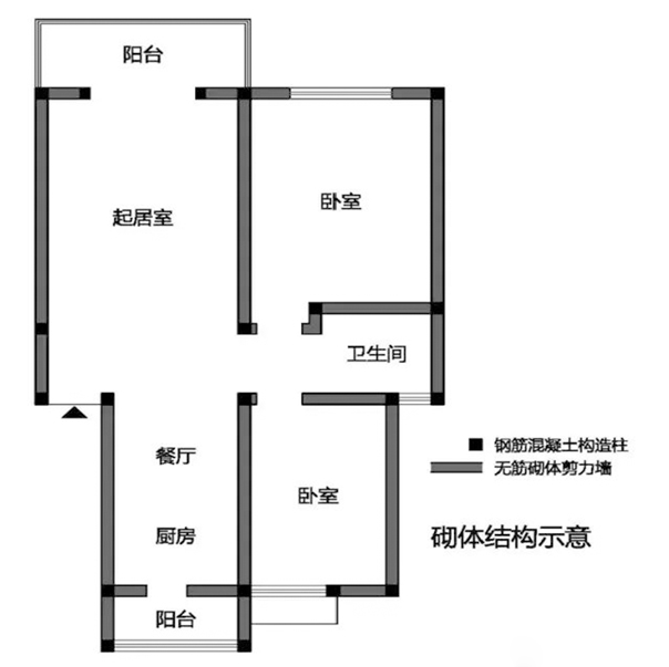 此为砌体结构体系的示意图,图上涂黑的方块是钢筋混凝土构造柱,而深灰色填充的则是砌体剪力墙,原则上他们都不能破坏,因为他们是互相结合承载整个建筑结构的荷载的。