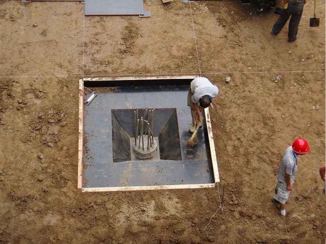 5、捣桩身以外的承台垫层地模砌好并抹面后,应尽快浇捣桩身以外部分的承台垫层。应根据基底标高在外侧地模上弹出标高线,如采用原有土模时。