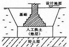 垫层法是指把基础下一定深度的湿陷性黄土换填成好的土层,以减小建筑物的沉降,提高地基承载能力。此方法施工方便且地基在施工后得到明显改善,故在我国得到广泛应用。