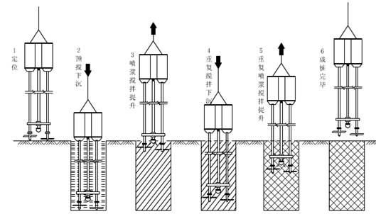定桩位安装桩机制备水泥浆液预搅下沉提升喷浆搅拌重复上下搅拌清洗横(或后)移对位、调平,进入下根桩施工搅拌桩顶部与上部结构的基础或承台接触部分视情况可增加水泥浆量或增加搅拌一次。