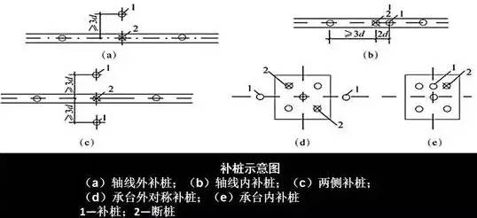 当施工中出现断裂桩时,应及时会同设计人员研究处理办法。根据工程地质条件、上部荷载及桩所处的结构部位,可以采取补桩的方法。条基补1根桩时,可在轴线内、外补[下图(a)、(b)];补2根桩时,可在断桩的两侧补[下图(c)]。柱基群桩时,补桩可在承台外对称补[下图(d)]或承台内补桩[下图(e)]。