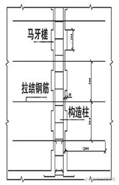 (2)设计为马牙搓的构造柱,从每层柱脚开始,砌筑时必须严格执行先退后前的原则,阻保证柱脚为大断面。每一马牙搓的齿高一般约为30cm(5层砖高),齿深不小于6cm.当齿深为12cm时,其上口采用一层进6cm、再一层进12cm的方法,使马牙搓上口死角的混凝土能保证浇捣密实。