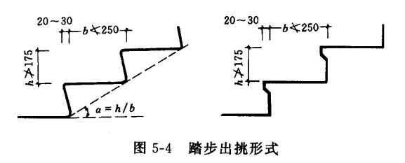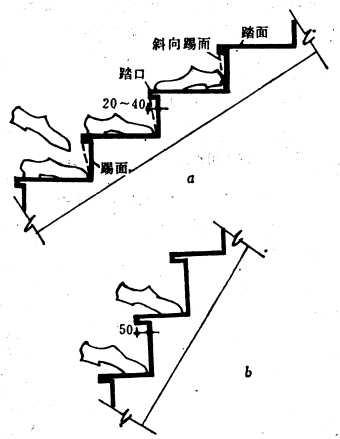 为了在踏步宽度一定的情况下增加行走舒适度,常将踏步出挑20~30mm。