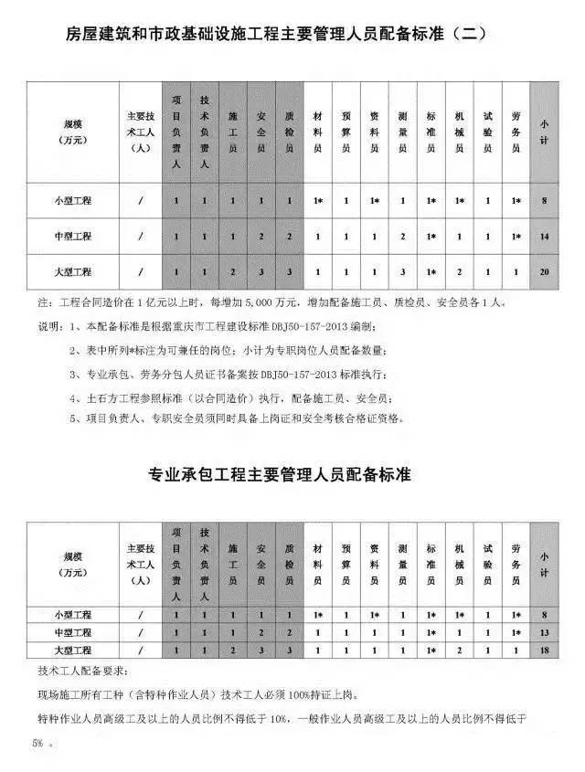 二、房建及市政工程主要管理人员配备标准