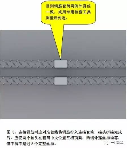 6、连接钢筋时应对准轴线将钢筋拧入连接套筒,接头拼接完成后,应使两个丝头在套筒中央位置互相顶紧,两端外露丝扣不超过 2 个完整丝扣。