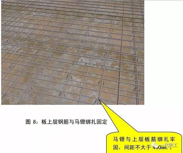 5、现浇板底层钢筋铺设完放置马镫,其间距不大于 500mm,与上层板筋绑扎牢固。