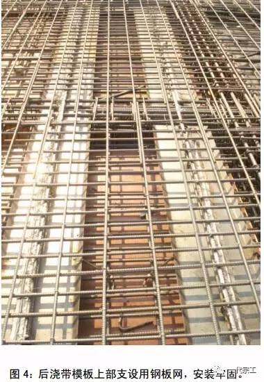 2、现浇板后浇带模板上部侧口模板与钢筋位置锯槽吻合,安装牢固,或采用钢丝(板)网支设牢固,上口两侧加设木方,并用木模板整体封闭、保护,直到砼浇筑时打开。