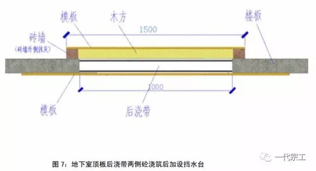 3、地下室顶板后浇带两侧砼浇筑后加设挡水台,地下室外墙后浇带按设计方案执行。