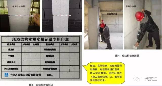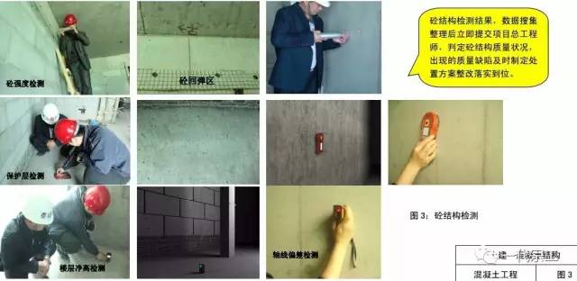 2、按照规范要求项目(砼强度、钢筋保护层的厚度、轴线偏差、楼层标高净高;截面尺寸、垂直度、平整度、)实施检测和检查,留存好原始记录,并做好现场标识。