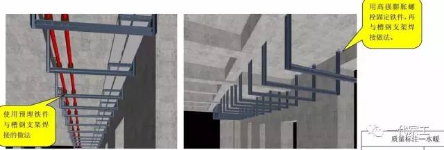 1)铁件预埋式支吊架:跟随结构施工,将铁件按照策划排布图的坐标、标高、间距定位预埋;在预埋完成的铁件上确定支吊架的水平面标高,将制作的支吊架焊接在预埋的铁件上。