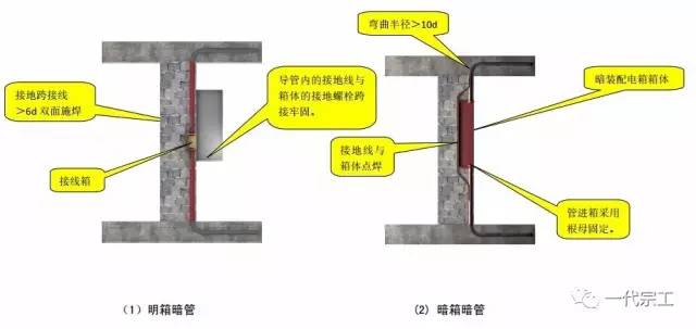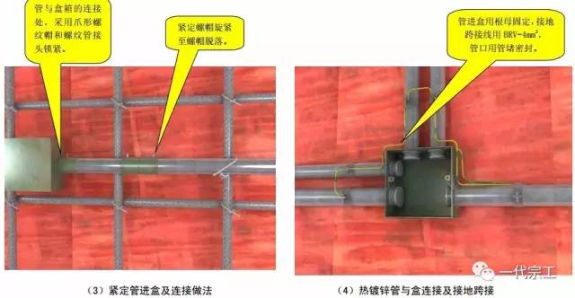 3、紧定式薄壁钢导管接地线进箱盒处采用配套的爪型锁母,管连接处拧断紧定螺钉做法。