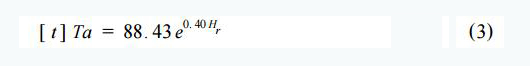 式中c为碾压混凝土层间的凝聚力,MPa;f为碾压混凝土层间的内摩擦系数;Hr为环境大气相对湿度;t为碾压混凝土的层间间隔时间,h;Ta为碾压混凝土层间间隔时的仓面环境温度,℃;e为自然对数之底。取龙滩水电站重力坝碾压混凝土的设计层间凝聚力c=3.24MPa、层间内摩擦系数f=1.56,测定不同大气相对湿度,当仓面环境温度Ta变化时,可得到层间间隔时间[t]的值,按对应值拟合曲线得出他们之间的简化关系式: