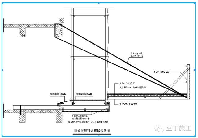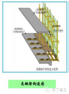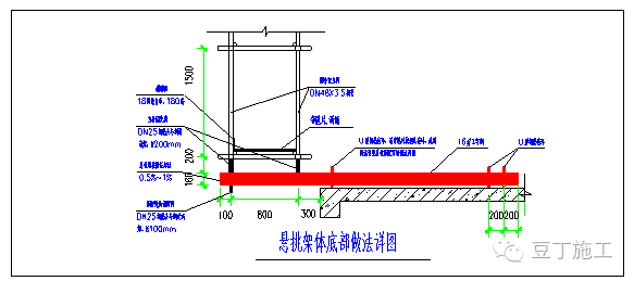 根据相关规范及我司的经验,在悬挑梁上设置立杆固定脚,采用DN25钢筋头与钢梁满焊。