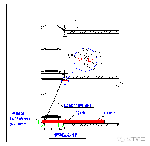 工字钢悬挑端设置一道 14(619)的斜拉钢丝绳,钢丝绳与建筑结构拉结的吊环采用直径为20㎜的HPB235 级圆钢筋。工字钢与钢丝绳拉结的下部应焊接防滑构件,防止钢丝绳的滑动。其大样图如图所示: