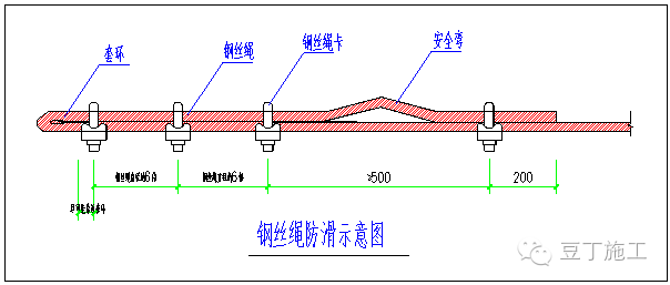 钢丝绳的受力卡扣应等距布设3个或以上,间距钢丝绳直径6倍,第4个卡扣为保险卡扣。钢丝绳卡扣螺丝应全部拧紧,不允许松动,绳的末端应形成一个安全弯,以检视绳受力时有无末端滑移的现象。其大样图如图所示: