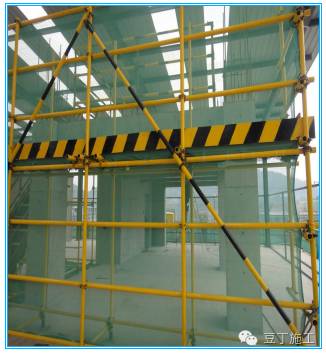 4) 脚手架内侧形成临边的(如遇大开间门窗洞等),在脚手架内侧设1.2m的防护栏杆和30cm高踢脚杆。