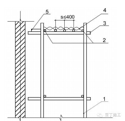 1立杆;2纵向水平杆;3横向水平杆;4竹笆脚手板;5其它脚手板