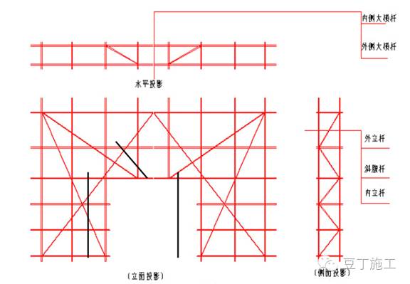 2)外架按立杆与大横杆交点处设置小横杆,两端固定在立杆,以形成空间结构整体受力。