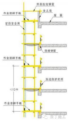3)脚手架外侧必须设1.2m 高的防护栏杆和30cm高踢脚杆,顶排防护栏杆不少于2道,高度分别为0.6m和1.2m。