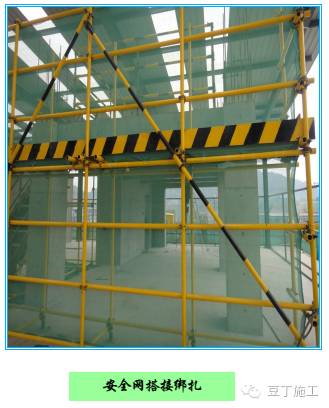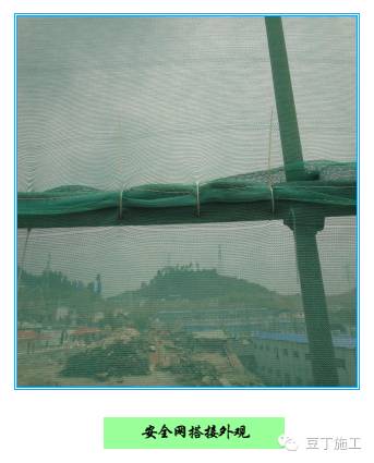 架体搭设高度满挂绿色密目式安全网;使用的密目式安全网必须是建设部认证产品。为保证密目式安全网的稳定性,在满挂安全网时,纵横双向间距750mm处用塑料打包带固定(严禁使用铁丝固定安全网),使安全网固定点密集,并增强观感。