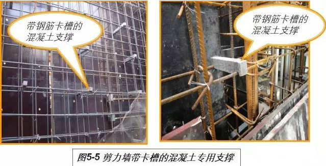 (4)剪力墙采用定型的带卡槽的混凝土支撑,控制钢筋保护层厚度和模板的空间尺寸(见图5-5)。