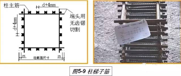 柱子梯子筋的固定:固定在1.5m高的位置,首先四角确定固定筋,然后进行绑扎。梯子筋固定好后,在进行其他筋的固定(见图5-11)。