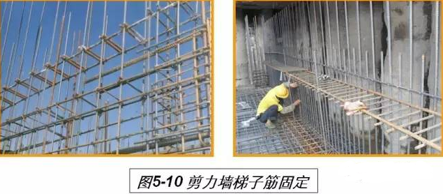 剪力墙梯子筋的固定:以楼层为相对点,在剪力墙高度1.5m的位置固定梯子筋,首先在端头绑扎定位竖向钢筋,然后将梯子筋固定在定位钢筋上,按梯子筋的间距和位置绑扎竖向钢筋(见图5-10)。