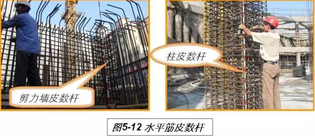 剪力墙、柱水平筋间距控制n柱箍筋、剪力墙水平筋按设计间距用油漆分色标划在皮数杆上,柱箍筋或剪力墙水平筋绑扎时将皮数杆立在构件的对角处,绑扎箍筋和水平筋时按皮数杆进行绑扎;剪力墙设置竖向梯子限位钢筋,控制水平钢筋的位置和间距(见图5-12)。