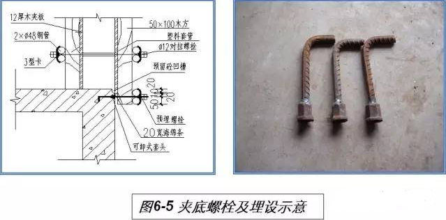 (3)为确保外墙边、楼梯间内侧等临边部位上下层接缝处砼产生涨模、漏浆现象,采用夹底螺杆固定模板根部(见图6-5)