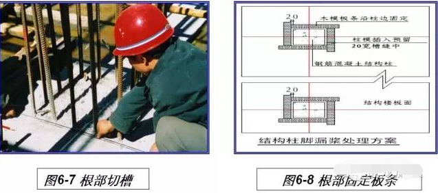 (3)为确保外墙边、楼梯间内侧等临边部位上下层接缝处砼产生涨模、漏浆现象,采用夹底螺杆固定模板根部(见图6-6)