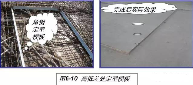 2)卫生间等有高低差的部位、有高低差的房间(室外与室内,厨卫间与房间等)应在高低差处采用方钢制作定型模板,或采用3号角钢与钢筋焊接,确保高低差处的边角整齐(见图6-10)