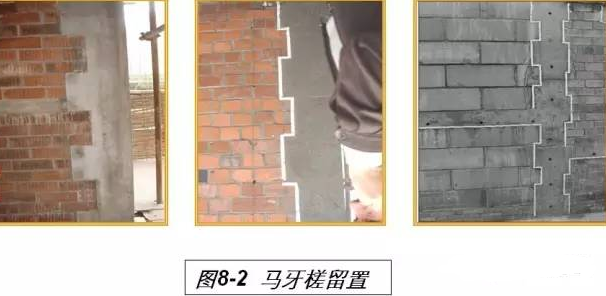构造柱处的墙体应留置大马牙槎(300mm),并先退后进,上下垂直。马牙槎口边宜贴易撕的薄海绵条,防止构造柱浇筑时漏浆(见图8-2)。