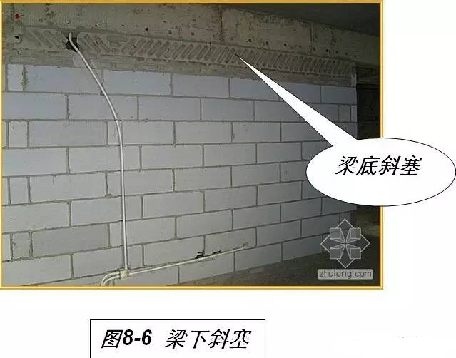 斜塞时采用专用的配砖,缝隙是配砖长度的三分之二至五分之四之间,配砖与梁底的夹角60~80度(见图8-6)。