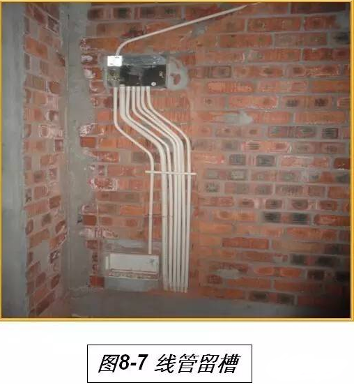线管宜预埋设在砌块的孔洞内或采用机械剔槽(见图8-7)。严禁开水平槽,确需埋设水平管时,应将线管埋设在混凝土板带中。线管槽每次填塞厚度不超过20mm,至上表面15mm位置设置钢丝网片,防止表面开裂。