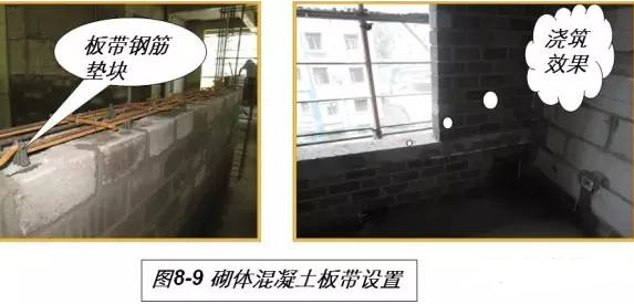 在外窗窗台标高位置设置通长现浇钢筋混凝土窗台梁、板带,加强整体性,防止裂缝发生。板带纵向钢筋应与横向分布筋绑扎,分布筋间距不大于250mm,设置垫块使钢筋位于板带混凝土上部三分之二的位置(见图8-9)。
