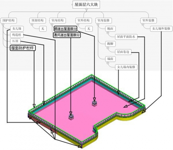 (六)屋面层包含哪些构件:屋面层和顶层一样,在建筑物里可能出现多次,我们可以把屋面层看作一个无顶的大房间。其中:◆围护结构:通常会出现女儿墙、构造柱、压顶、防护栏杆。◆顶部结构:在屋面层里不存在。◆室内结构:通常是烟道、通风道等构件。◆室外结构:如果把挑檐雨篷归入顶层,那么屋面层的室外结构就不会有构件出现。◆室内装修:这时的地面在屋面层变成了屋面防水的平面部分,踢脚变成了屋面卷边部分,墙面变成了女儿墙的内装修,墙裙和天棚不会和出现。◆室外装修:就是女儿墙的外装修。屋面层六大块示意图见图3.24: