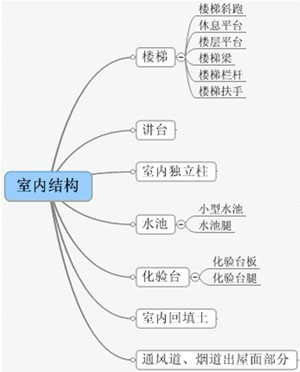 首层室内结构包含的构件可能有:讲台、楼梯、室内独立柱、水池、化验台等占室内空间的构件,见图3.3: