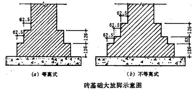 1)带形砖基础。带形砖基础通常有:等高式和不等高式两种大放脚砌筑方法,如图所示,