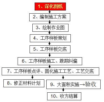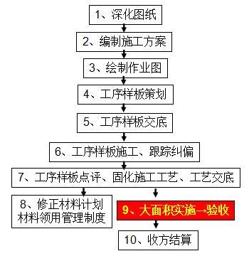 标准层或标准单元:必须以样板带路。样板施工完成后,现场实际清理材料需用数量,按样板用量提出材料计划。