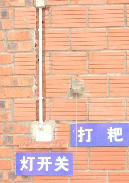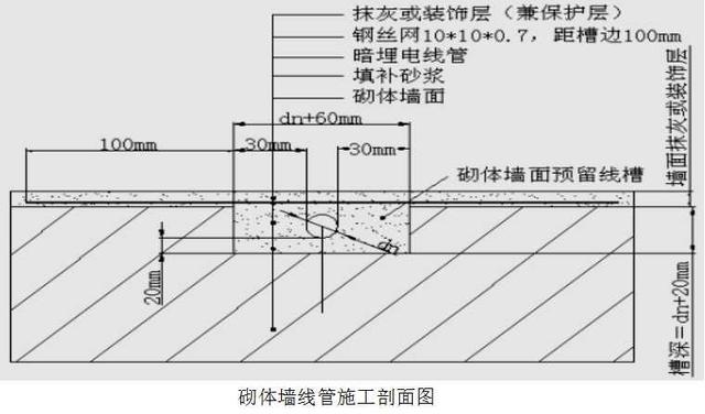 2、墙身、地面开线槽之前用墨盒弹线,以便定位。管面与墙面应留15mm左右粉灰层,以防止墙面开裂。接入配电箱、盒内的线管,应在砌体时让瓦工直接砌入墙体内或预留管槽, 严禁人工打凿;土建预留管槽时上下间隔500mm埋入8钢筋,作为以后固定管路用,在第一皮砌块砌筑时接好线管,使用预埋的钢筋固定,线槽预留或开槽尺寸:砌体墙槽深度dn+20mm,墙槽宽度dn+60mm。空心砌块外墙水平沟槽长度小于390mm;墙槽用细石砼填补密实低于砌砖面5mm,线管排列整齐大于15mm,间距均匀,线管绑扎牢固;空心砌块墙体的竖向电管线应随墙体砌筑埋设在砌块孔洞内;线管敷设应在墙中问位置,线管连接紧密,管口光滑,保护层大于15mm,使用胶粘剂连接紧密、牢固。