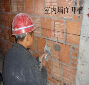 3、砖墙或砌体墙需开槽时,应先在槽两边弹线,然后使用专用切割机沿弹线切割后用快錾子把中间剔掉,严禁用錾子直接踢墙槽,避免用力猛剔,造成洞口或槽剔的过大、过宽,甚至影响土建结构质量。槽宽及槽深均以比管外径大20mm为宜。