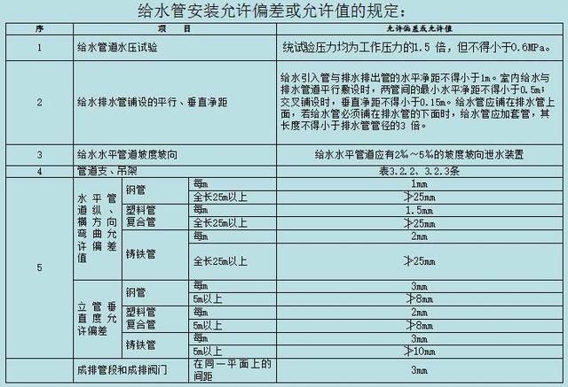 住宅内给水立管,管中心距板、墙(未装修)最远不得大于100mm,最近不得小于60mm。给水系统安装完毕,综合水压试验和系统冲洗必须符合设计要求和施工规范规定。