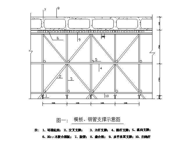 6.2.按模板施工方案搭设模板支架,宜采用满堂模板支撑体系,使用钢管脚手架杆,应适当加大底模板的刚度,减少底模板的变形,支柱下安装可调螺旋支座。并在支柱位置在垫板上弹线控制。(见图一)。钢管模板支架应符合《建筑施工扣件式钢管脚手架安全技术规范》的有关规定