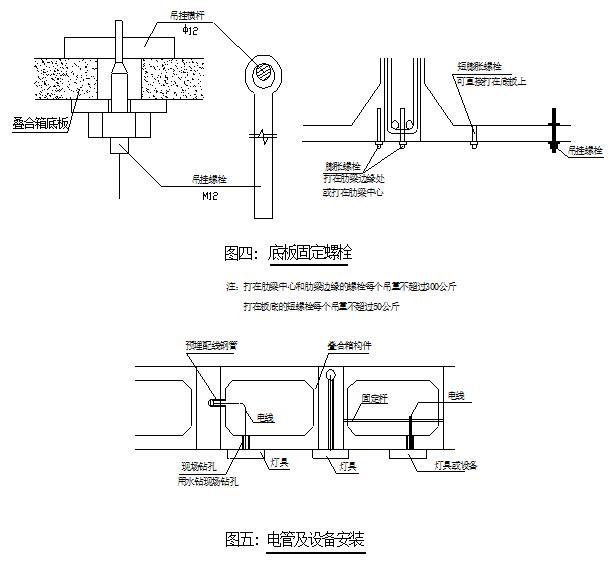 6.11.1叠合箱底、顶板的水电安装预留孔洞,可用电动水钻钻孔,预留安装的配电穿管,灯具螺栓、电扇吊钩等应在安装叠合箱顶板前完成(见图四、图五)。