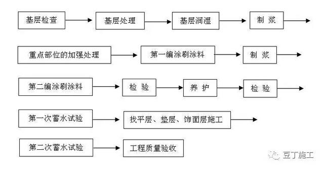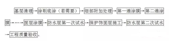 施工时应边涂刷边检查,发现缺陷及时修补,现场施工员、质检员必须跟班检查,检查合格后方可进入下一道涂层施工,特别要注意平立面交接处、转角处、阴阳角部位的做法是否正确。自检合格后报请监理方/建设方进行防水层的整体验收,防水层完工干燥48h后应做24h蓄水试验,不渗不漏为合格。第一次试水合格后即可做保护饰面层。保护饰面层施工完毕应做第二次试水试验,以最终无渗漏为验收合格。