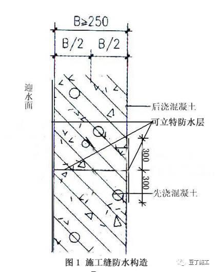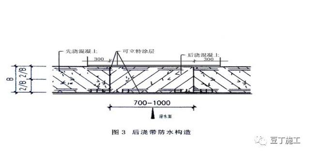 后浇带:在浇筑后浇带混泥土前干撒可立特防水材料,用量每平方米2kg。混泥土终凝后在地下室内侧沿后浇带涂刷两遍,每边超出后浇带30cm(见图3)。