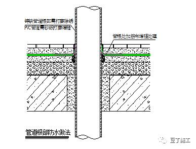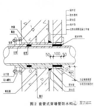 管根、固定件:将部件周边开2cm2cm的U形槽,清理干净后涂刷PCC-501一遍,待涂层初凝后用PCC-501半干团填平压实,(套管式穿墙管见图2)。