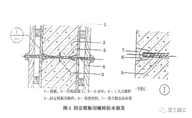 3、固定模板用的穿墙螺杆必须按本施工工艺中细部处理方案割掉并用水泥砂浆抹平。