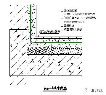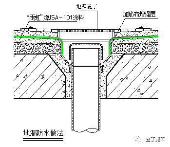 在地漏、管根、阴阳角等易发生漏水的部位应增加一层加筋布加强处理。首先用橡胶刮板或油漆刷厚度均匀地涂刷一遍JSA-101涂料,涂刷宽度300mm为宜,并立即粘贴加筋布进行加筋增强处理。加筋布粘贴时,应用漆刷摊压平整,与下层涂料贴合紧密,搭接宽度100mm,表面再涂刷一至二层涂料,使其达到设计要求的厚度。做法如下图