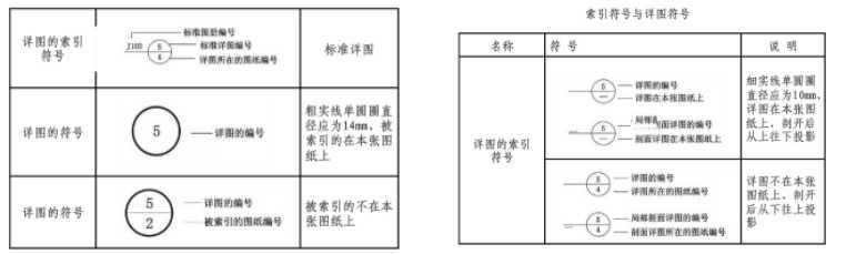 在施工图中,有时会因为比例问题而无法表达清楚某一局部,为方便施工需另画详图。一般用索引符号注明画出详图的位置、详图的编号以及详图所在的图纸编号。